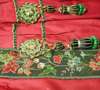 the red field with allover stylised foliate motifs in the manner of Christopher Dresser, with applied floral embroidered border and applied rosettes and having tassles to the tops,