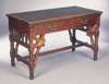 the rectangular top with inset leather sciver and dentil edging above arcaded frieze with two drawers to the front, raised above turned and blocked suports with decorative crossed turned and blocked brackets and linked by chamfered stretchers