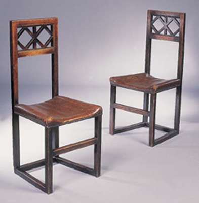each with lozenge lattice panels to the backs, above upholstered seats on square section legs linked by stretchers (2)