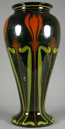 with everted rim and spreading base, painted with a frieze of elongated flowering plants, impressed marks,