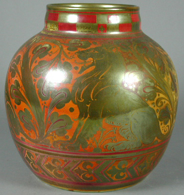 by Richard Joyce, of oviod form with cylindrical neck, painted with a frieze of lions seated among foliage, impressed marks, painted monogram