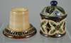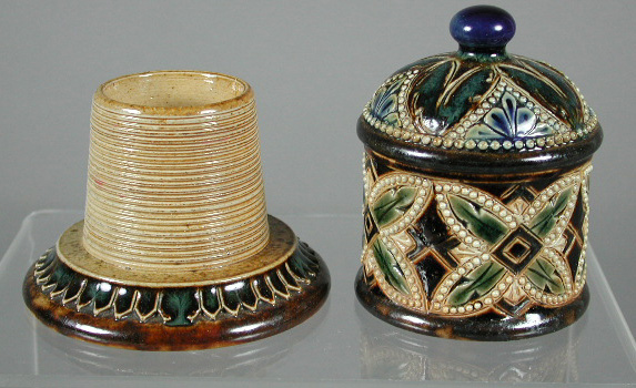 painted in lovat, blue, brown and white with incised and beaded floral decoration, impressed and incised marks AEB, no 680, and dated 1882 (2)