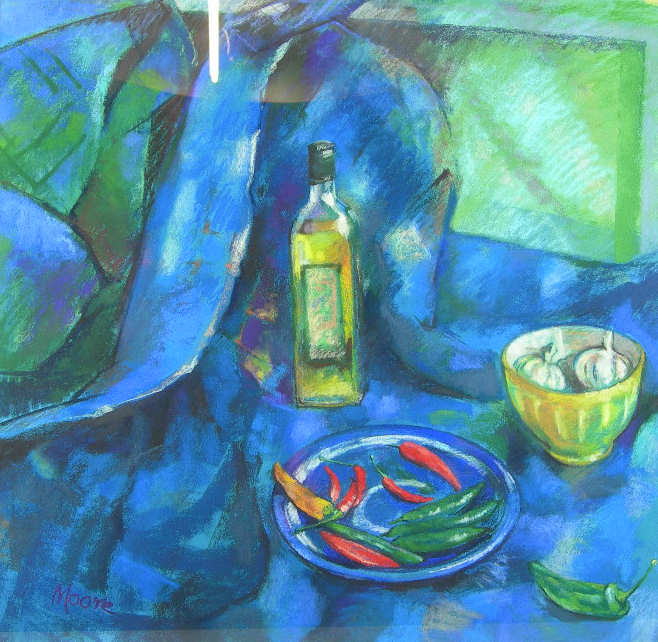 STILL LIFE WITH CHILLIES AND OLIVE OIL