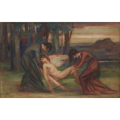 Note: Stewart Carmichael was best known for his leading role in the Celtic Revival movement in Dundee, creating striking paintings of scenes from Celtic mythology and Scottish history. As a young man, he was inspired by the work of fellow Dundonian artists George Dutch Davidson and John Duncan, and his reputation was first established with his decorative murals for public buildings in the city.