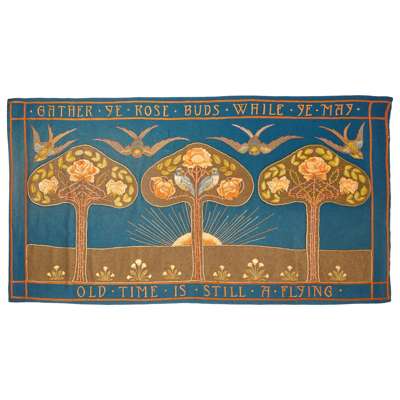coloured silk threads on a wool ground, lined, bears inscription GATHER YE ROSEBUDS WHILE YE MAY/ OLD TIME IS STILL A FLYING
