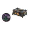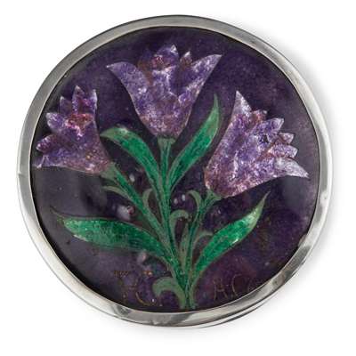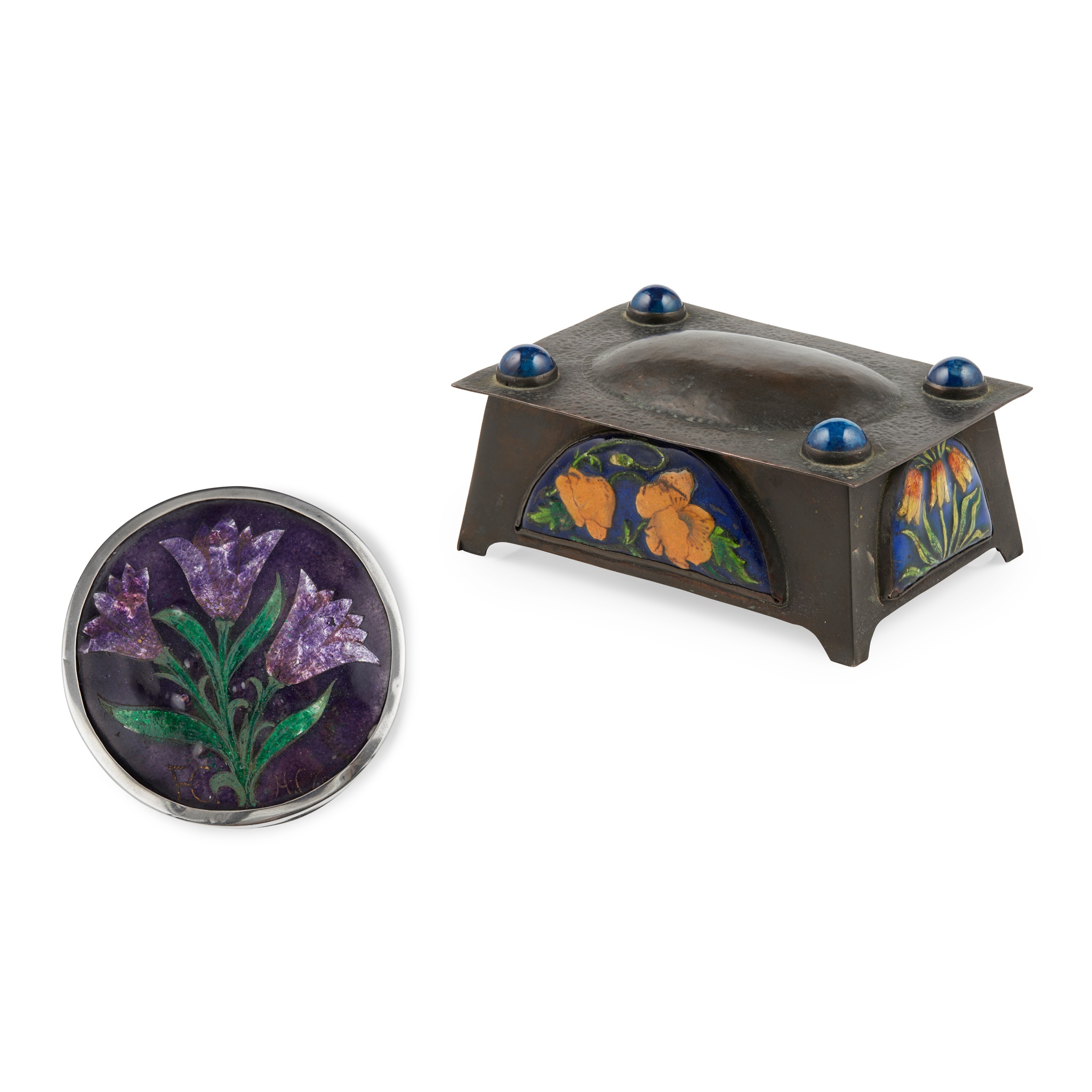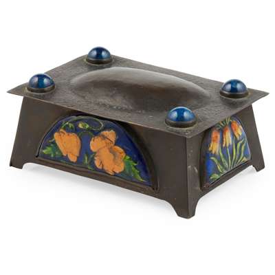 copper and enamel, set with four blue cabochons, with applied enamel demi-lune panels, 12cm wide, 4.5cm high, 8cm deep; together with a BOX & COVER, silver plate, set with an enamel panel, bearing initials F.C/ H.C, 5cm high
