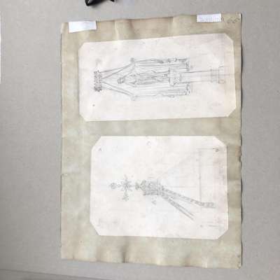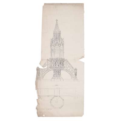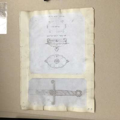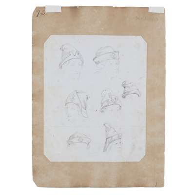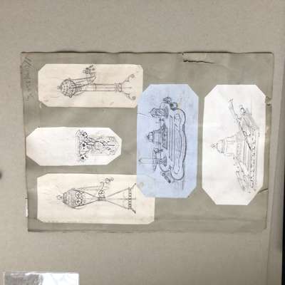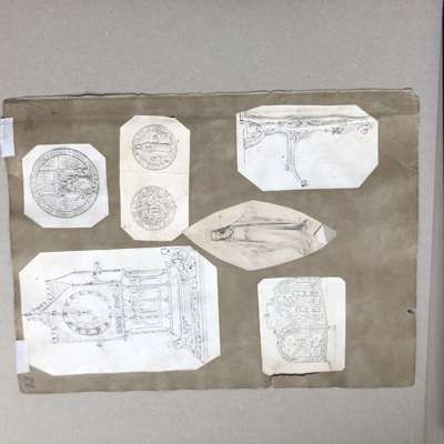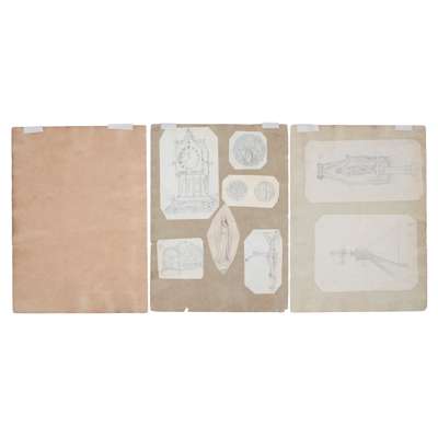 to include: ORIGINAL DRAWINGS FOR A TEAPOT AND SUGAR BOWL WITH TONGS, CIRCA 1860, pencil, pen and ink on paper, mounted onto card, 17cm x 21cm and 14cm x 11.5cm; also an ORIGINAL DRAWING BY THE SAME HAND, depicting studies of medieval caps and cap badges, pencil, pen & ink on paper, mounted verso, 25cm x 20cm, card inscribed 72/ 30856/15 (1) and 71/ 30856 (15); together with THREE SHEETS OF ORIGINAL DRAWINGS, ATTRIBUTED TO A.W.N. PUGIN FOR HARDMAN & CO., the FIRST SHEET comprising two drawings of INKWELLS, for the Palace of Westminster, 9cm x 16.5cm and 9cm x 17.3cm; two of THURIBLES ON STANDS, 17.5cm x 7cm and 15cm x 6cm; one of a GOTHIC REVIVAL WALL MOUNTED BRACKET, 14cm x 5cm; a MONUMENTAL CLOCK, 17.5cm x 11cm and five further drawings of MEDALLIONS; A CASKET; A DEPICTION OF THE VIRGIN; and a WALL BRACKET; the SECOND SHEET comprising a drawing of a PAIR OF SIDE DISHES, 21cm x 20cm; a SWORD HANDLE, 10cm x 21cm; and verso a FONT COVER, 20cm x 14.5cm; and a STATUE OF CHRIST ON A PEDESTAL, 23cm x 11.3cm; the THIRD SHEET with drawings of a GOTHIC FRAME, 17.3cm x 11.7cm; a POLE SCREEN, 23cm x 8.5cm; a CHAMBER CANDLESTICK, 12.5cm x 16cm, each pencil, pen & ink on paper, mounted onto card; and ORIGINAL DESIGN FOR A PULPIT FOR THE MARQUIS OF BUTE BY JOHN HARDMAN POWELL FOR HARDMAN & CO., pencil, pen & ink on paper, with inscription "Design for a Pulpit in oak "carved"/ Marquis of Bute", bears makers embossed stamp HARDMAN & CO., 61cm x 26cm