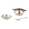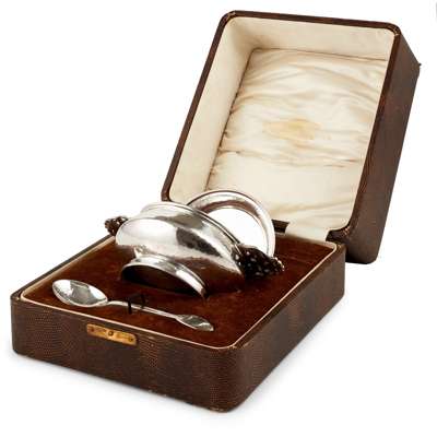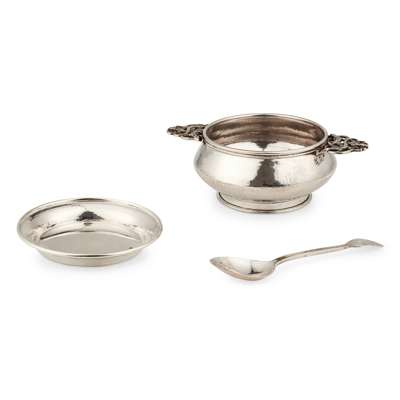 silver, comprising a QUAICH, 16cm across; a SAUCER, 10cm diameter; and a SPOON, 13.5cm long, each with stamped maker's marks AEJ and hallmarks for Birmingham 1930, the spoon hallmarked Birmingham 1929, in fitted case