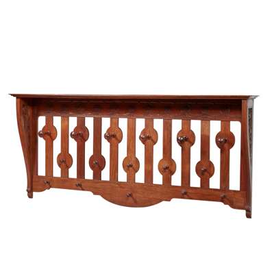 mahogany, supported by pierced and carved brackets, enclosing slats and turned pegs
