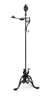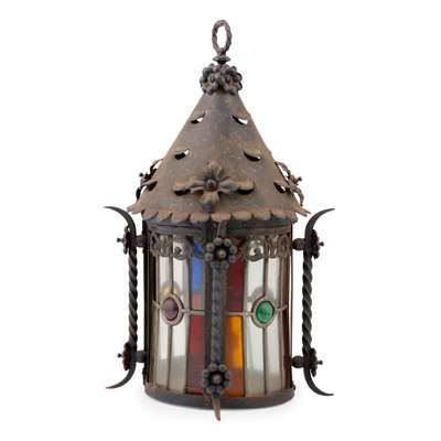 wrought iron, raised on adjustable column, 144cm high (closed); together with a GOTHIC REVIVAL HANGING LANTERN, with stained glass panels, 42cm high