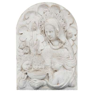 Note: This stone carving may have its inspiration from Our lady of Fatima, an apparition reported in 1917 by three shepherd children at the Cova da Iria, in Fátima, Portugal. On 13 May 1917, the children reported seeing a woman "brighter than the sun, shedding rays of light clearer and stronger than a crystal goblet filled with the most sparkling water and pierced by the burning rays of the sun."