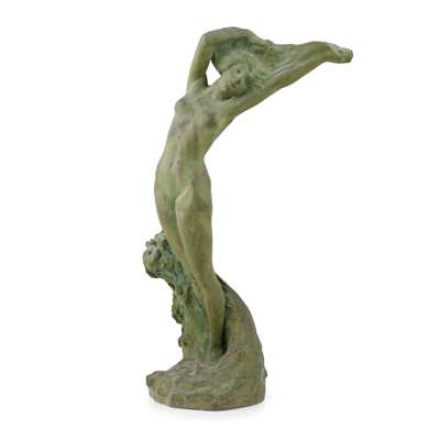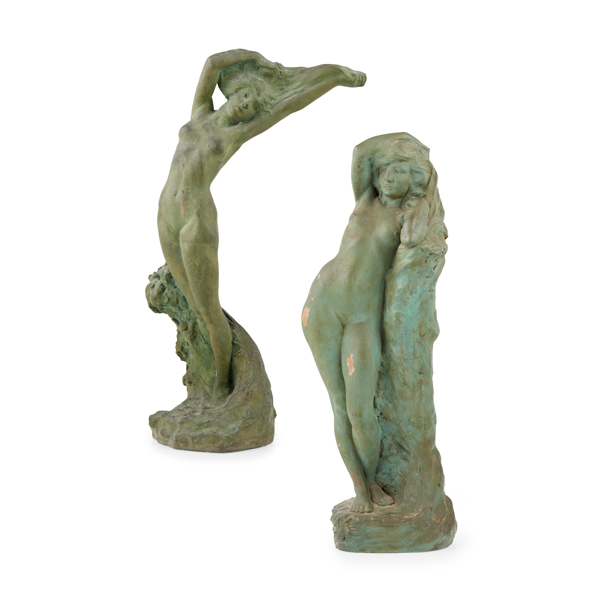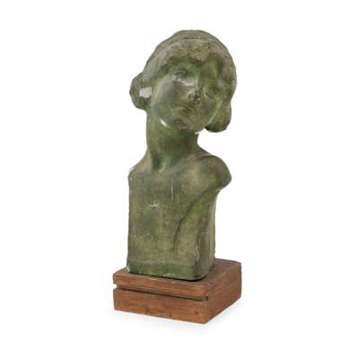 patinated plaster, signed on the base GEORGE, 57cm high; together with another ART NOUVEAU FIGURE, by the same hand, patinated plaster, signed on the base F.W. GEORGE, 51.5cm high; and a BUST OF A GIRL, also by the same hand, patinated plaster, signed and inscribed MISS PRIM, with initials GF, 21.5cm high