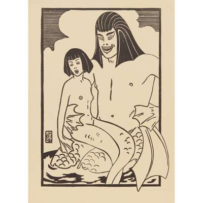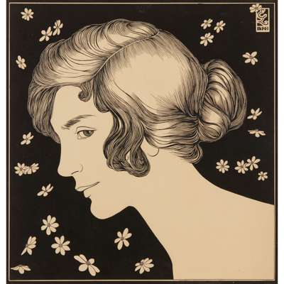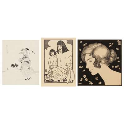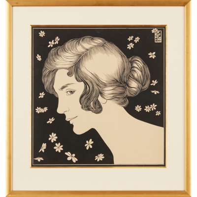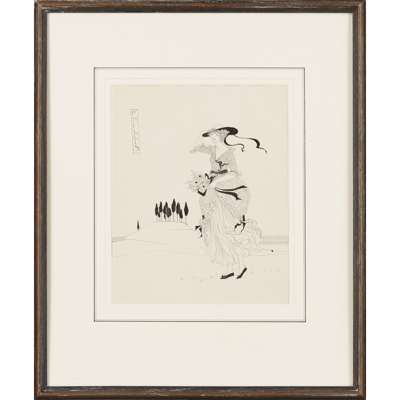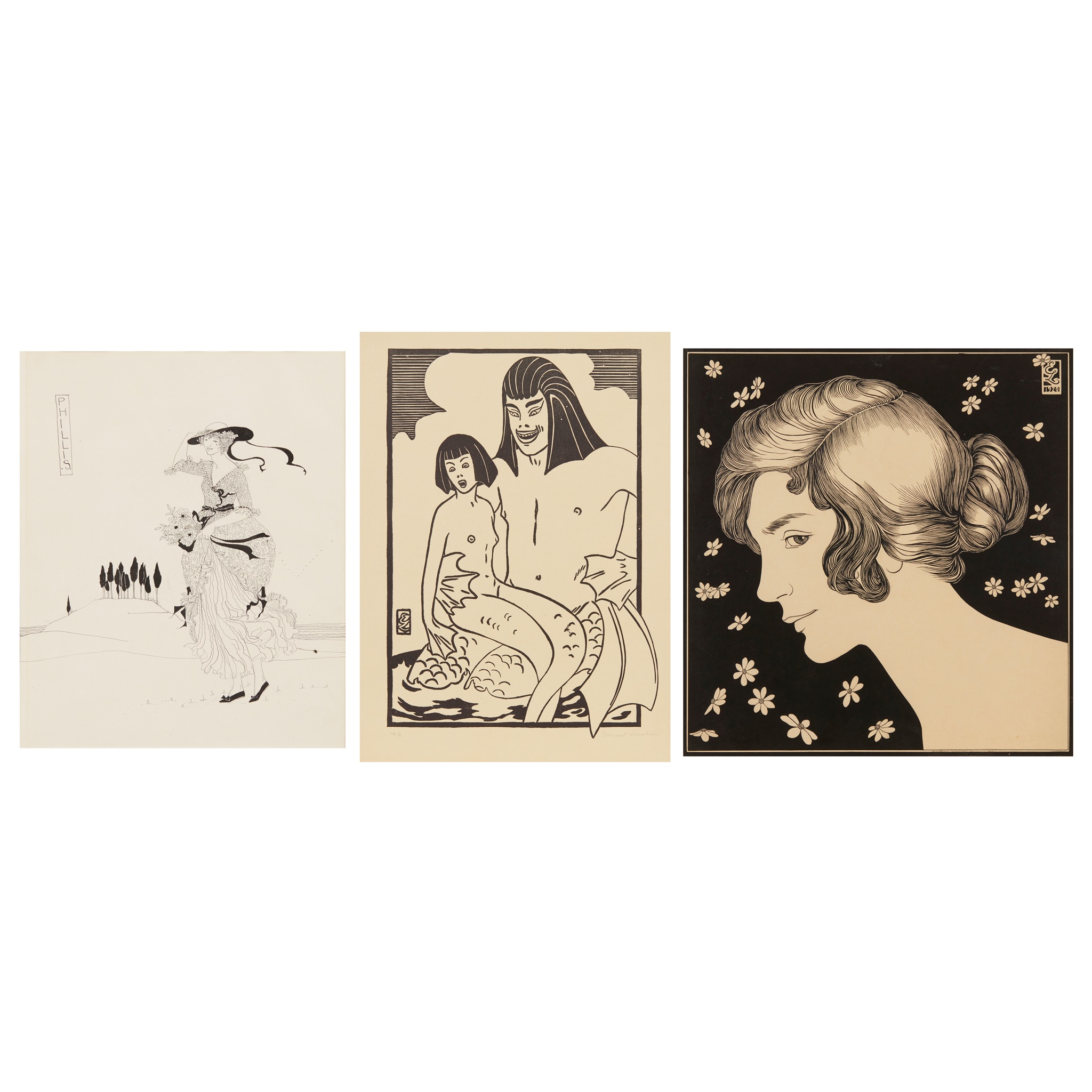 pen and ink, inscribed, bears gallery label verso, 24cm x 20cm; together with EDMUND LUCCHESI (1871-1964) HEAD OF A GIRL, pen and ink, signed with initials and dated EL/ 1920, 34.5cm x 32cm; and a print by the same hand, signed and editioned in pencil 14/2, 30cm x 22cm