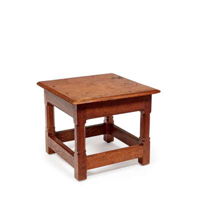 oak, bears embossed metal label, RUSSELL AND SONS BROADWAY WORCESTERSHIRE, bears paper label GR EXHIBITION 1919 30-32 ONE OF THREE STOOLS LENT BY LADY RUSSELL, DATED 1919.
