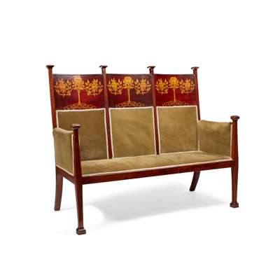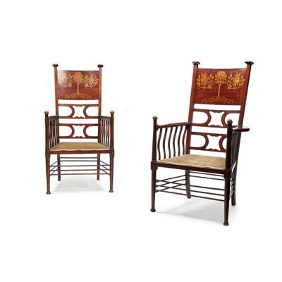 mahogany, comprising a SETTEE, 133cm wide, 112cm high, 67cm deep; and A PAIR OF MATCHING ARMCHAIRS, each with broad backs inlaid with stylised flowering rose trees, 61cm wide, 113cm high, 57cm deep