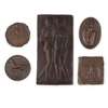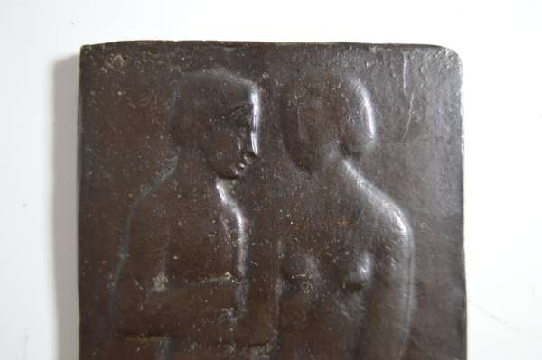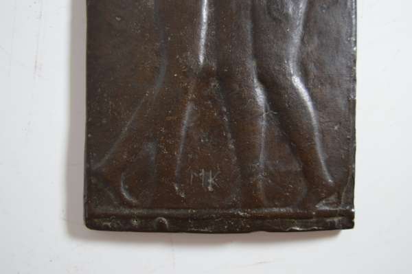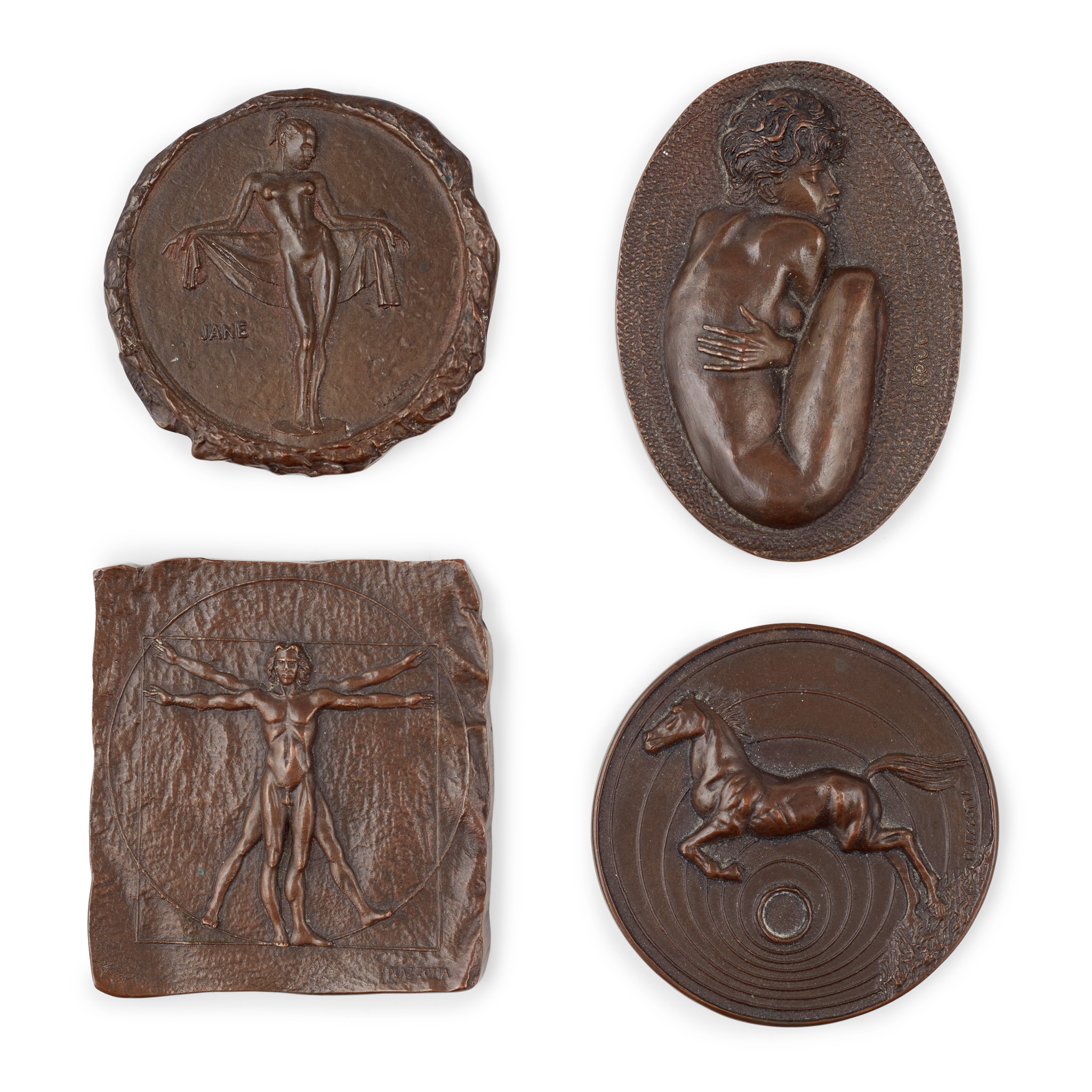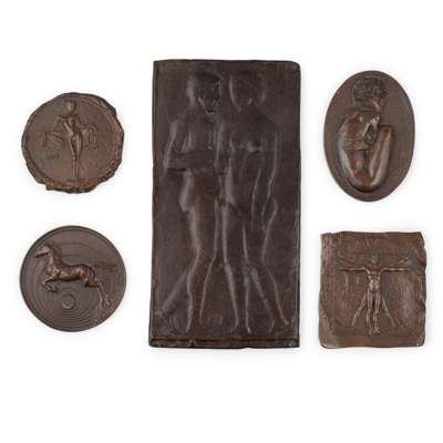 bronze, depicting JANE; 6cm diameter; CROUCHING GIRL, 7.5cm across; 'LEONARDO', 6cm x 6.5cm; and 'REARING STALLION', 6cm diameter, together with A FURTHER PLAQUE ATTRIBUTED TO MAX KLINGER, bronze, incised artist's initials MK, 16.5cm x 8.5cm