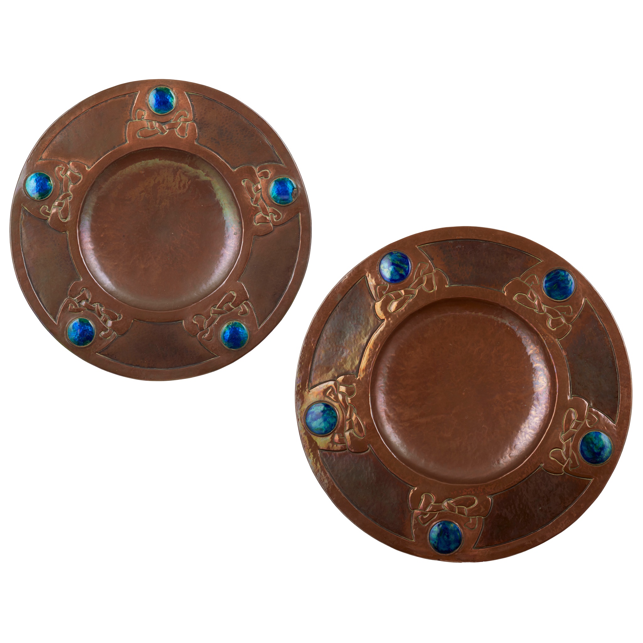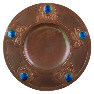 copper, with repoussé decoration, set with enamelled roundels