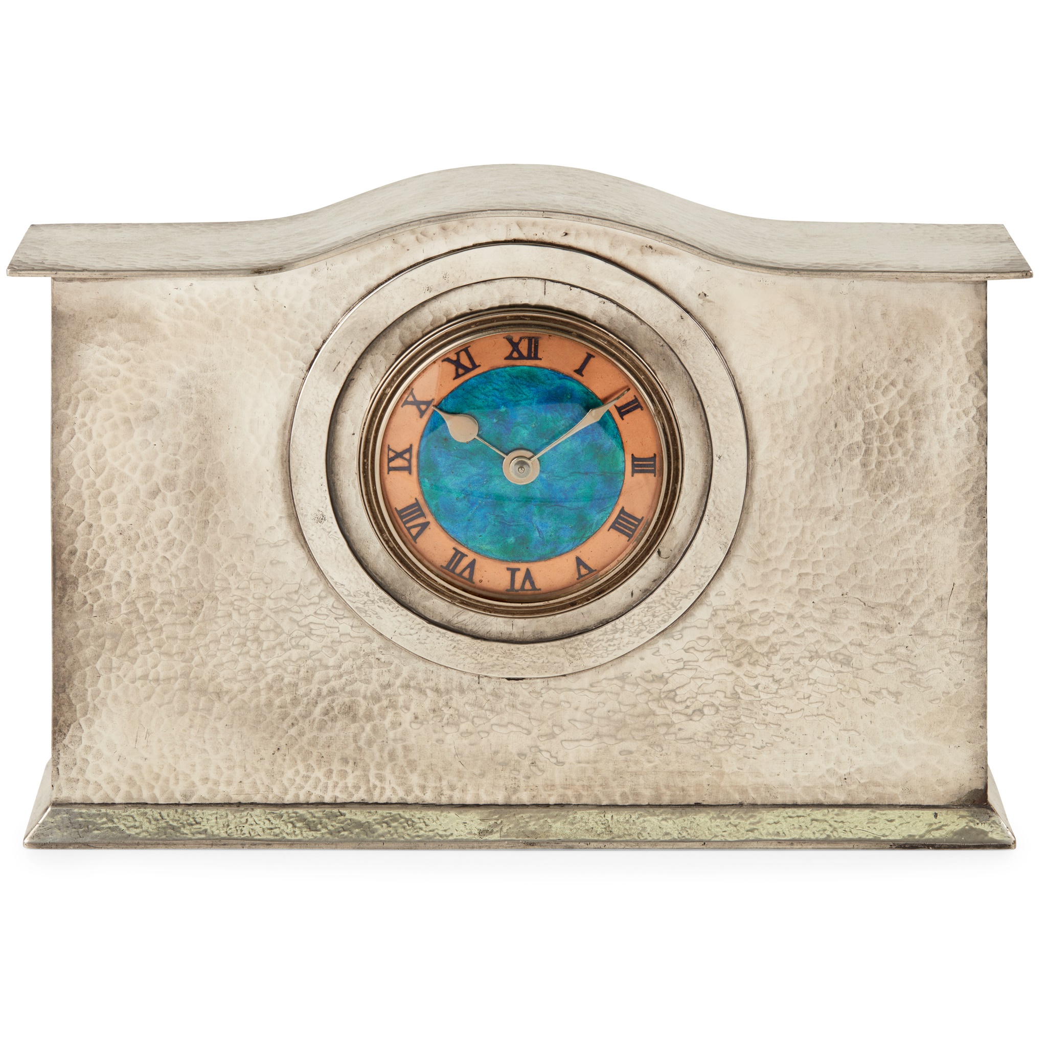 hammered pewter with copper and enamel dial, stamped to base ENGLISH PEWTER/ MADE BY/ LIBERTY & CO./ 01126