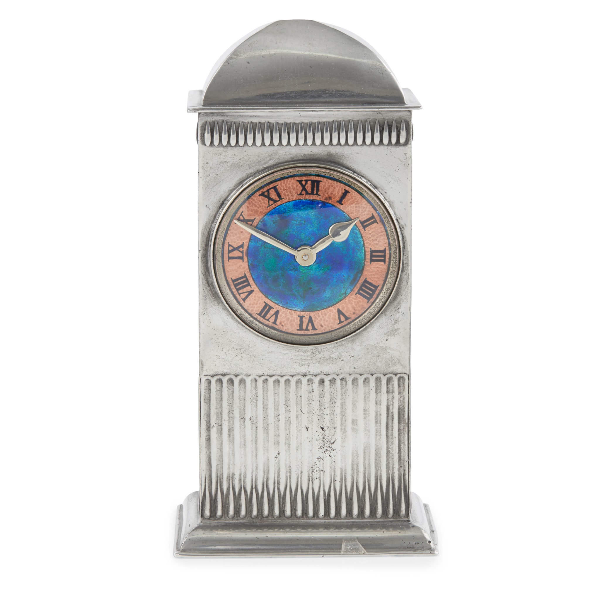 pewter, with copper and enamel dial, stamped maker's marks TUDRIC/ 01032/ MADE IN ENGLAND, with original key