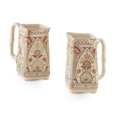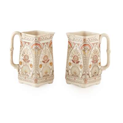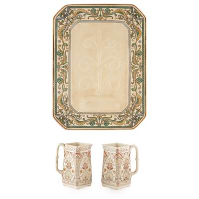 decorated with stylised flowers and foliage, impressed and printed maker's and retailer's marks with facsimile signature CHR. DRESSER, 38cm x 51.5cm; in Egyptian style; together with a PAIR OF OLD HALL POTTERY PITCHERS, CIRCA 1870, 16.5cm high