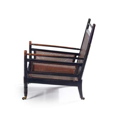 ebonised wood, with caned seat, back and arm panels, and with later cushions upholstered in period fabric circa 1880
