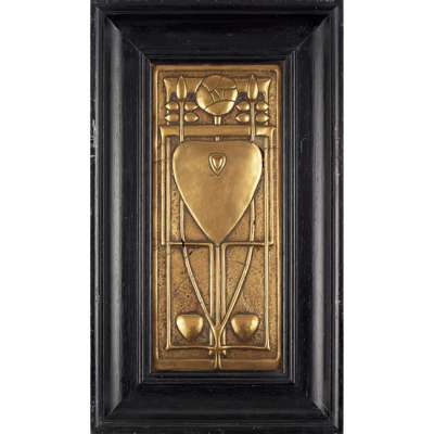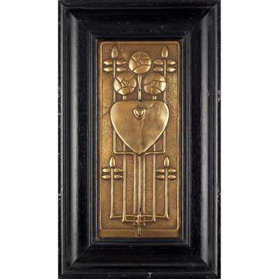 Note: After spending part of his early career working as an art editor in London, Talwin Morris took up a post as Arts Manager for Glasgow publisher Blackie & Son in 1898, a position he held until his death in 1911. He quickly became acquainted with Charles Rennie Mackintosh and the circle of artists associated with Blackie and the Glasgow School of Art, which had a significant influence on his work. Perhaps best known for his book designs, Morris also produced pieces of furniture, textiles and metalwork, which were incorporated into many of his decorative schemes, including his own home at Dunglass Castle and the refurbishment of W.W. Blackie's Printing Works where these panels formed part of an entrance screen. The panels demonstrate the key characteristics of the 'Glasgow Style', with their heavily stylised and linear plant forms and Glasgow roses.