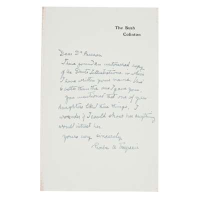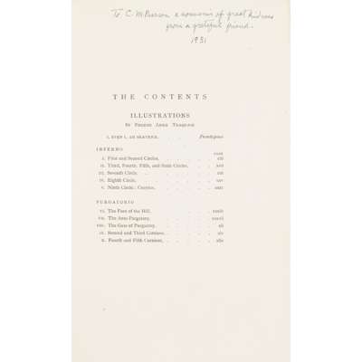 Note: The accompanying note, hand-written by Traquair, reads: Dear Dr. Pearson, I have found an untouched copy of the Dante Illustrations in which I have written your name. This is better than the one I gave you. You mentioned that one of your daughters liked these things, I wonder if I could show her anything would interest her, yours very sincerely, Phoebe A Traquair.