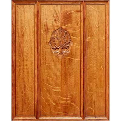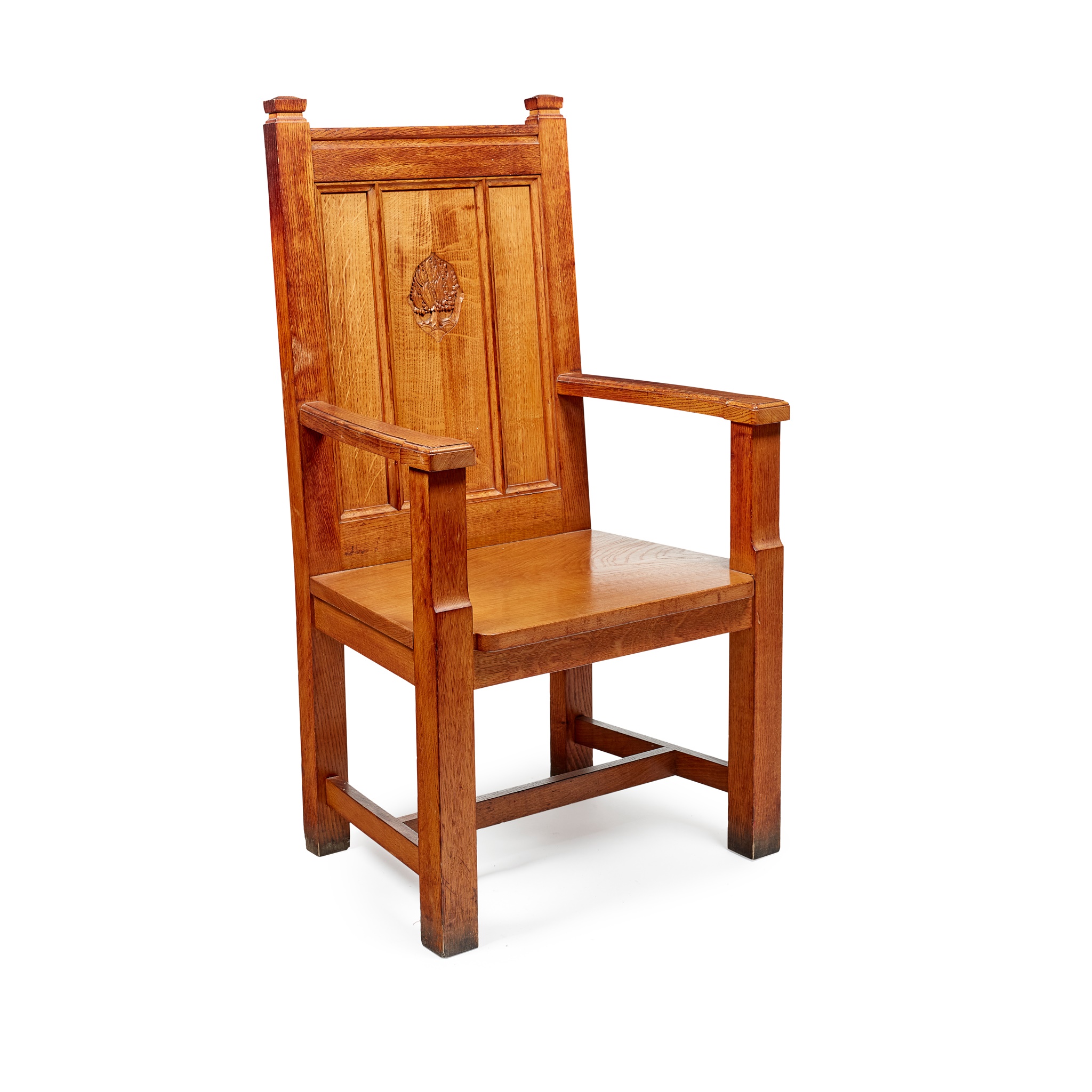 oak, carved with a design of the burning bush, bears makers label under seat rail SCOTT MORTON AND TYNCASTLE CO. LTD, MUIRIESTON ROAD EDINBURGH