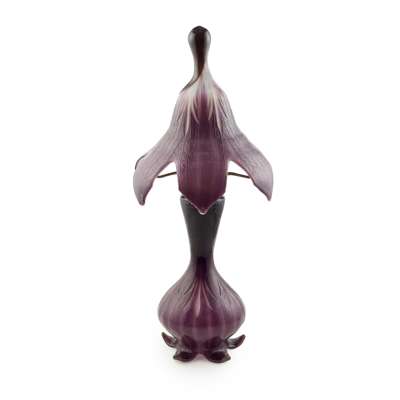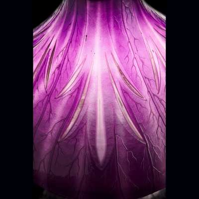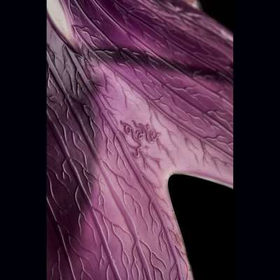 The lamp presented here is inspired by the snowdrop (Galanthus nivalis). The lampshade and the feet, blown separately, are made of double- glass, the internal layer milky white and the external layer violet-aubergine. The piece is engraved with vegetable acid. Moreover, the feet are engraved in intaglio with stylised snow crystals and a vertical signature Gallé. This lamp is very rare. There is a less rare version with a wrought iron mount that has appeared at auction several times.