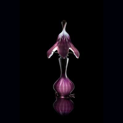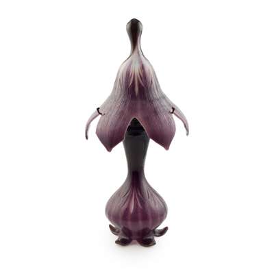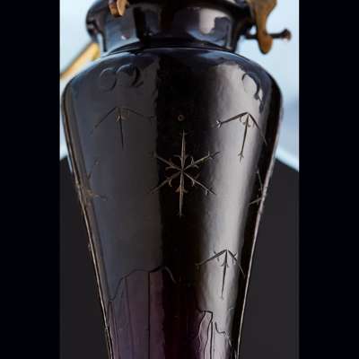 Note: For Émile Gallé, light was a source of justice, truth, and hope. Gallé was inspired by the symbolism of the lamp at a very young age and later he discovered that light also gives other nuances to glass. The arrival of electricity multiplied the decorative possibilities. At the Exposition Universelle of 1889 he created a large ornamental glasswork lamp in the form of a mosque, ‘an immense night-light as if veiled in black silk’. At the Salon du Champ-de-Mars of 1892, he exhibited a ‘violet-aubergine crystal lamp’ inscribed as Twilight with flowers mingled with amethysts and described by the French poet and essayist Sully-Prudhomme at the time;