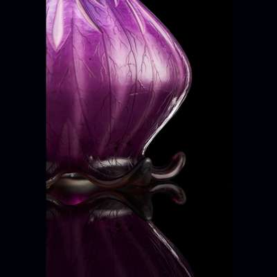 “A large piece of a sumptuous, clouded blood-red purple with ruby shards. Purpurine and livid vegetation is chiselled in relief. The edges are coloured in an opaque dark red to the opening. The frame is made of an inverted corolla in a sculptured palustrine oak.”