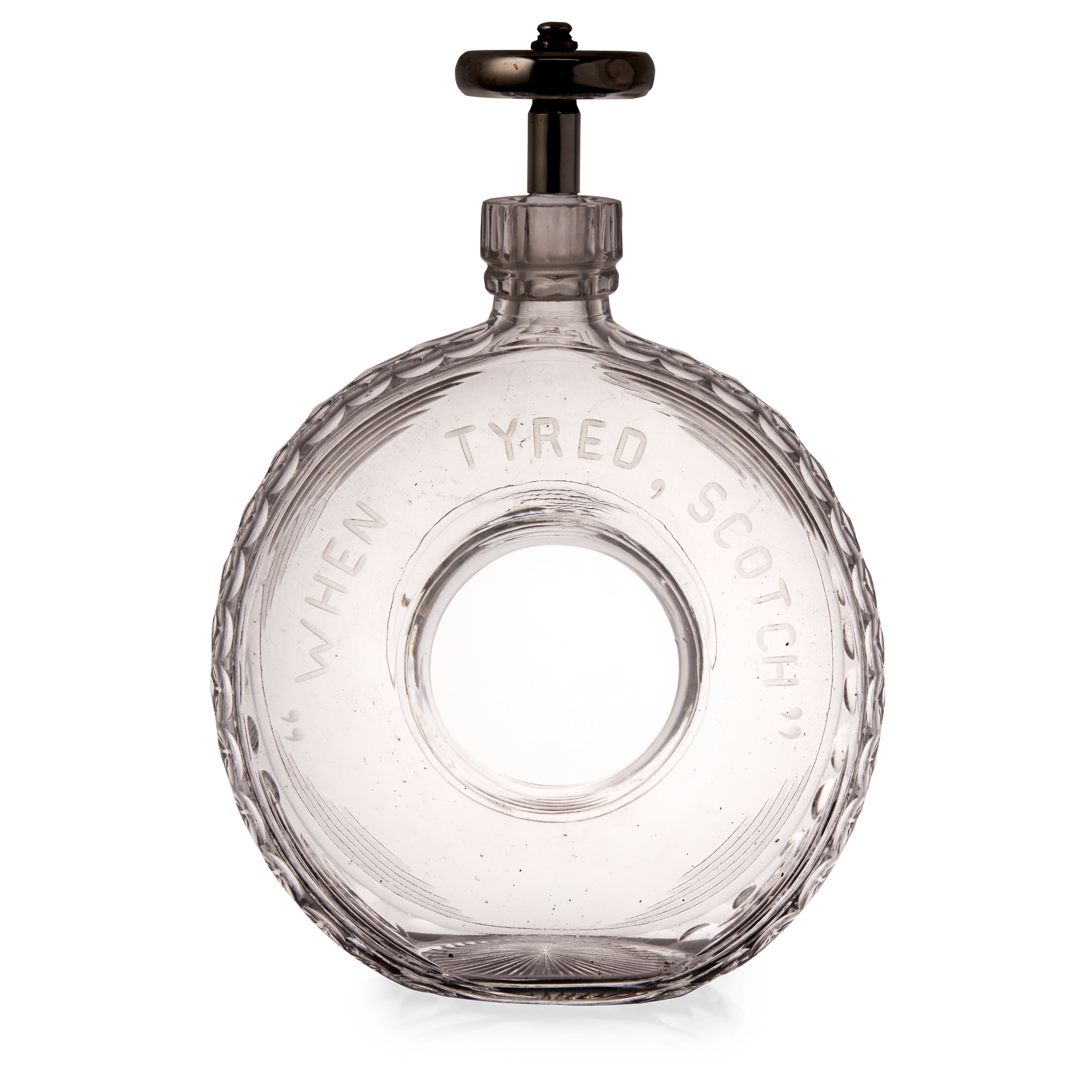 etched and cut glass, with silver coloured metal 'wheel' stopper, etched inscription WHEN TYRED, SCOTCH"