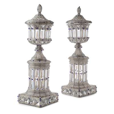 cut glass and coloured beads on a wire frame, the urn covers each turning to reveal three candle nozzles