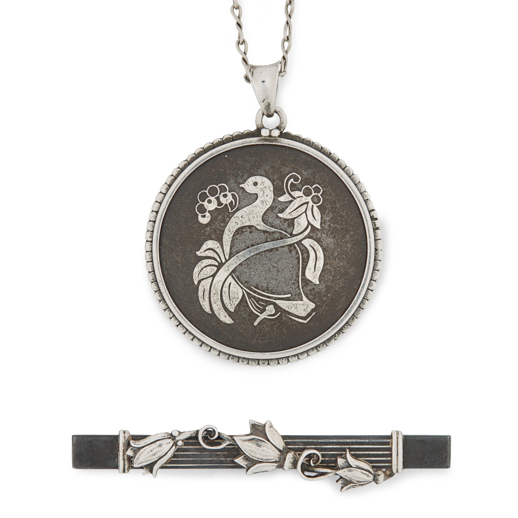 silver-inlaid iron pendant, with fine link chain, stamped maker's marks HN/ GEORG JENSEN/ 5014, 4cm diameter, total length 34cm; together with a GUNDORPH ALBERTUS BAR BROOCH, iron with applied white metal, pattern number 5018, stamped marks AG/ GEORG JENSEN/ 5018, 6.5cm long