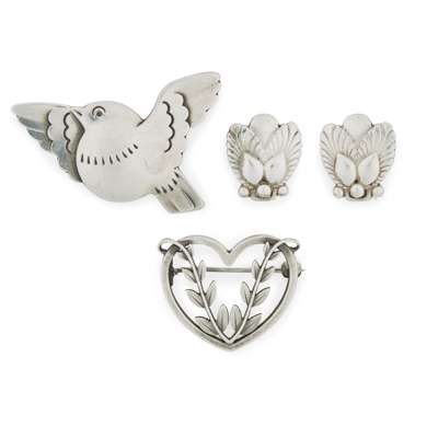 sterling silver, stamped maker's marks, GEORG JENSEN/ STERLING DENMARK/ 320, 4cm across; together with a GEORG JENSEN BROOCH, sterling silver, pattern 242B, marks for 1933-44, stamped maker's marks 925/ STERLING/ GJ/ DENMARK. 242B, 3cm across; and a PAIR OF GUNDORPH ALBERTUS EARRINGS, sterling silver, pattern number 110, impressed maker's marks GEORG JENSEN/ STERLING DENMARK/ 110, 1.5cm long