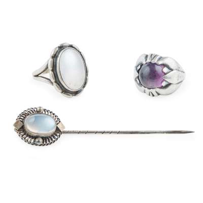 sterling silver and amethyst, stamped maker's marks GJ/ 830/ DENMARK/ 830/ 59; together with a further GEORG JENSEN RING, sterling silver, set with a moonstone; and a GEORG JENSEN TIE PIN, sterling silver and moonstone, pattern number 13, stamped maker's marks GJ/ 830/ S/ GEORG JENSEN/ 13, 6.5cm long