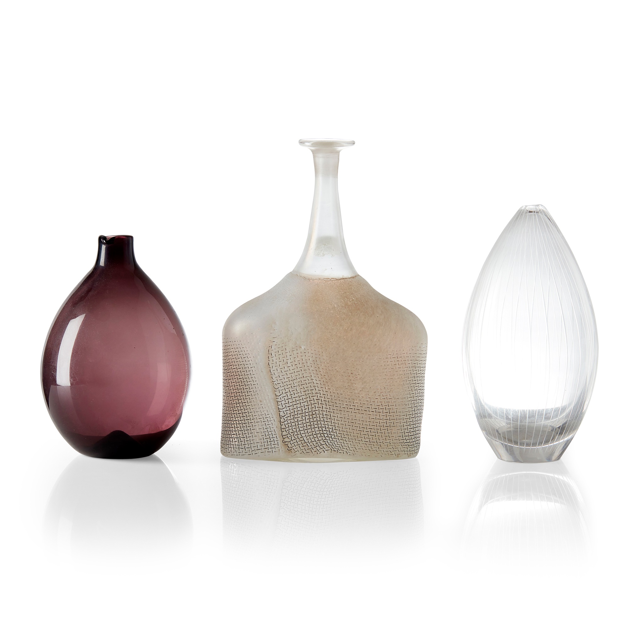 glass, engraved marks, 18cm high; together with a Timo Sarpaneva 'Pullo' carafe/decanter, 15.5cm high; and a Bertil Vallien for Kosta Boda vase, 23cm high