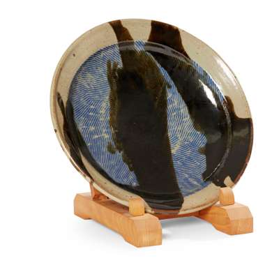 stoneware, Tenmoku, cobalt and wood ash glazes, maker's mark to base WP (with wooden stand)
