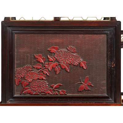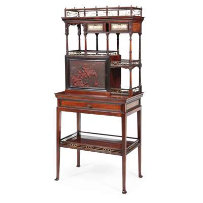 Note: Howard & Sons (1820-1947) were founded by John Howard in 1820 as a ‘Cabinet Manufacturer’, opening an upholstery workshop and showroom in 1832. They exhibited widely, from the Great Exhibition of 1851 to the Paris Exhibition of 1900 where they won one silver and two gold medals. Commissions included a bookcase designed by C.F. Hayward for John Jones, circa 1862, now in the collection of the Victoria & Albert Museum; sentry boxes at St. James' Palace; the ballroom floor of the Savoy Hotel; and twenty-four pieces of furniture in the Royal Collection, as well as numerous pieces in the private collection of HM The Queen at Sandringham and Balmoral. This cabinet incorporates several Oriental elements, including drawer fronts made of Meiji lacquered ivory panels of samurai, an early Cinnabar lacquer panel as the cupboard front, and a drawer handle and key adapted from Japanese sword fittings.