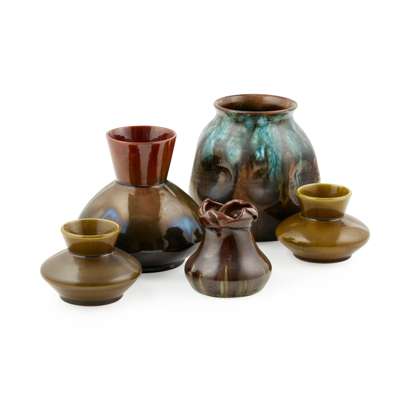 comprising a DIMPLED VASE, unmarked, 15cm high; a PAIR OF OLIVE GREEN VASES, each impressed 174, 7cm high; a LARGER SIMILAR VASE, unmarked, 14.5cm high; and a further VASE, with crumpled rim, 9cm high; together with SEVEN LINTHORPE-STYLE VASES, including a PAIR OF BOTTLE VASES, 12.5cm high; a PAIR OF LUGGED VASES, 11cm high; TWO SIMILAR SHOULDERED VASES, 10cm high; and a TALL BOTTLE VASE, 24cm high, all unmarked