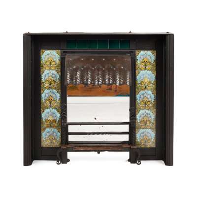 cast iron with inset tiled panels and copper canopy in the manner of John Pearson, cast mark MARLBOROUGH PATENT NO 13355 243C, REG NO 236240