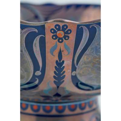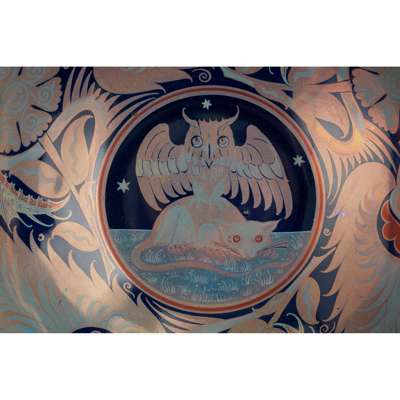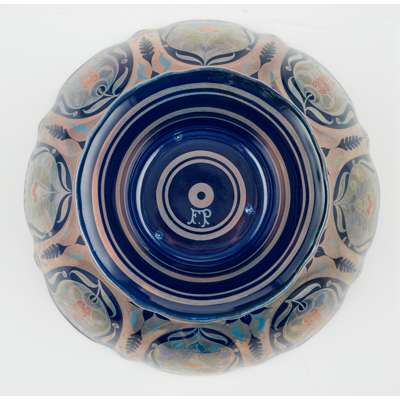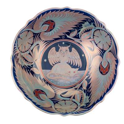 Literature: Greenwood, M. The Designs of William De Morgan, Richard Dennis 2007, p. 224 pl. 155 where a bowl of the same shape from the 'Sunset & Moonlight Suite' is illustrated. See also p.245, pl.306 where the central design on this bowl is illustrated on a tile.