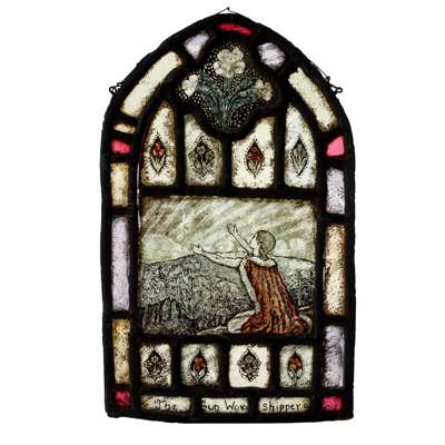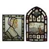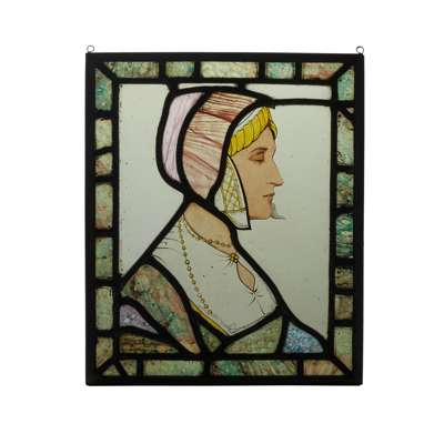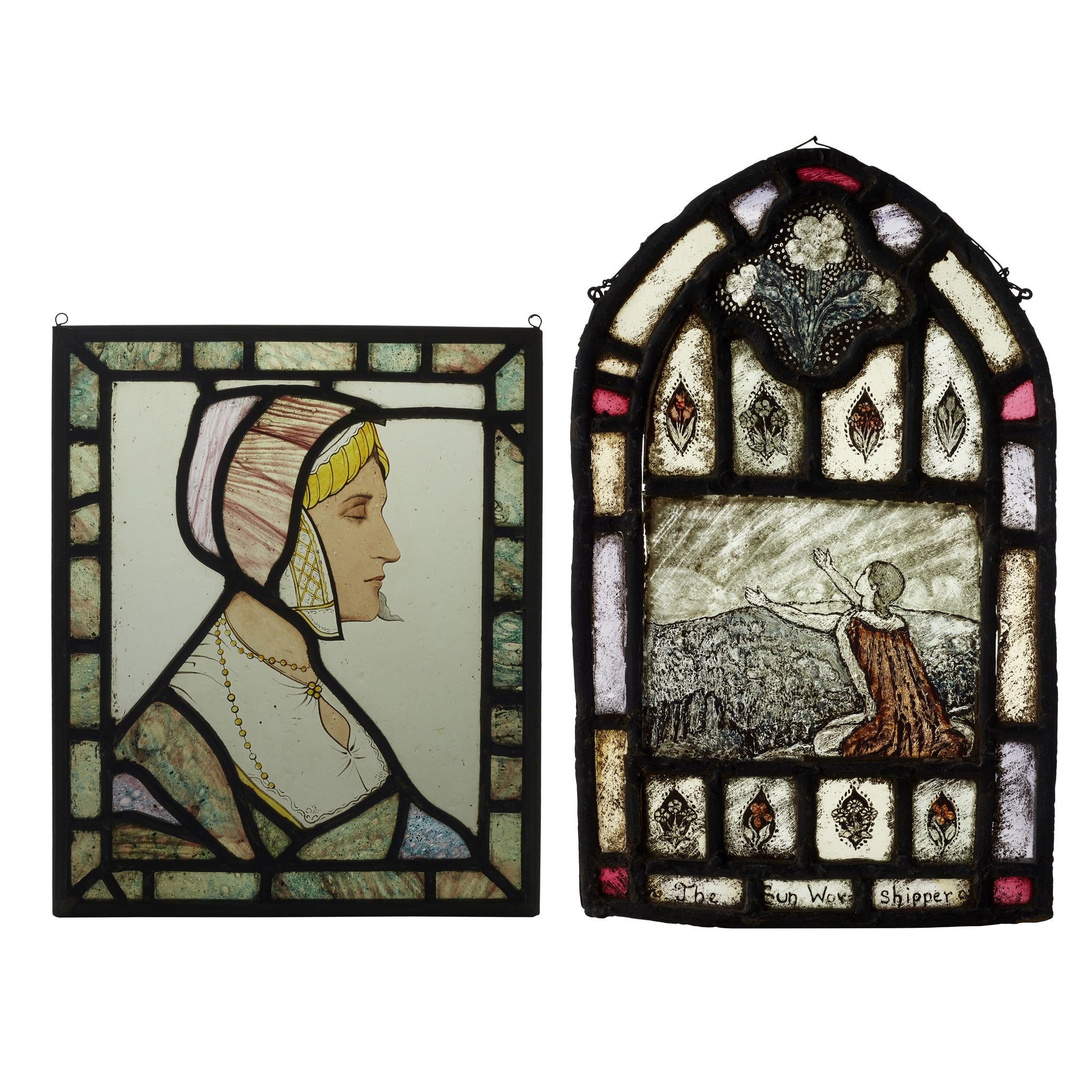 stained, leaded and painted glass, depicting a portrait of Elizabeth Dauncey after Hans Holbein, 32.5cm x 26.5cm; together with a further STAINED GLASS PANEL, 'THE SUN WORSHIPPER', stained, leaded and painted glass, bearing inscription THE SUN WORSHIPPER, 31cm x 19.5cm