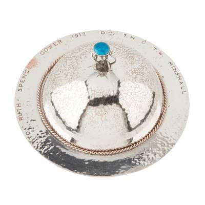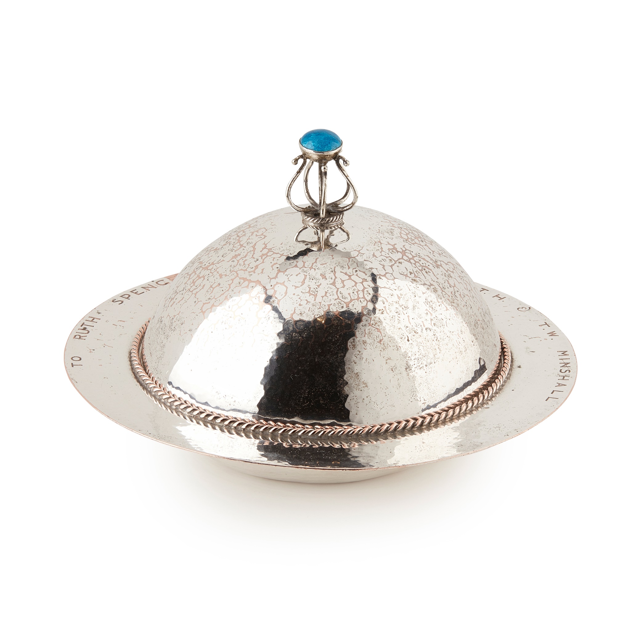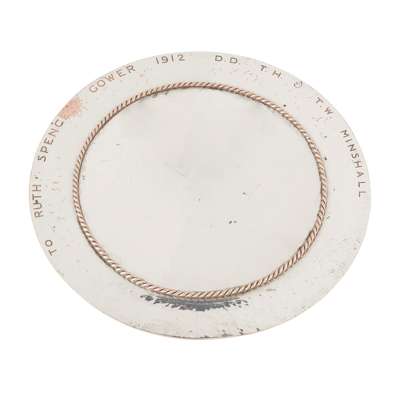 silver plate with enamel set openwork finial, bears an inscription to rim TO RUTH SPENCE GOWER 1912 D.D. T.H. & T.W. MINSHALL