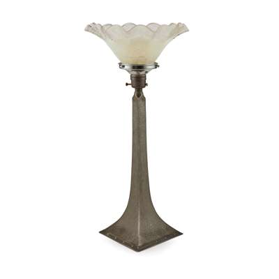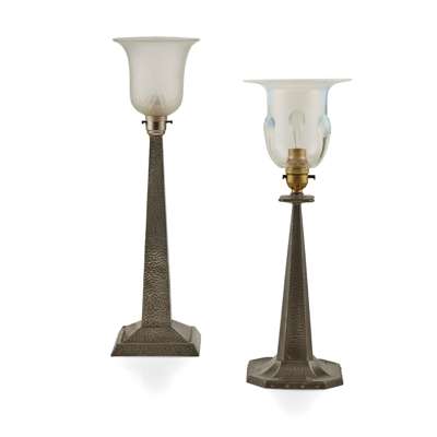 pewter, each with matched glass shades, 50cm high; 45cm high and 40.5cm high; together with a further TABLE LAMP BASE, plated brass, bears registration number 593937, 35cm high