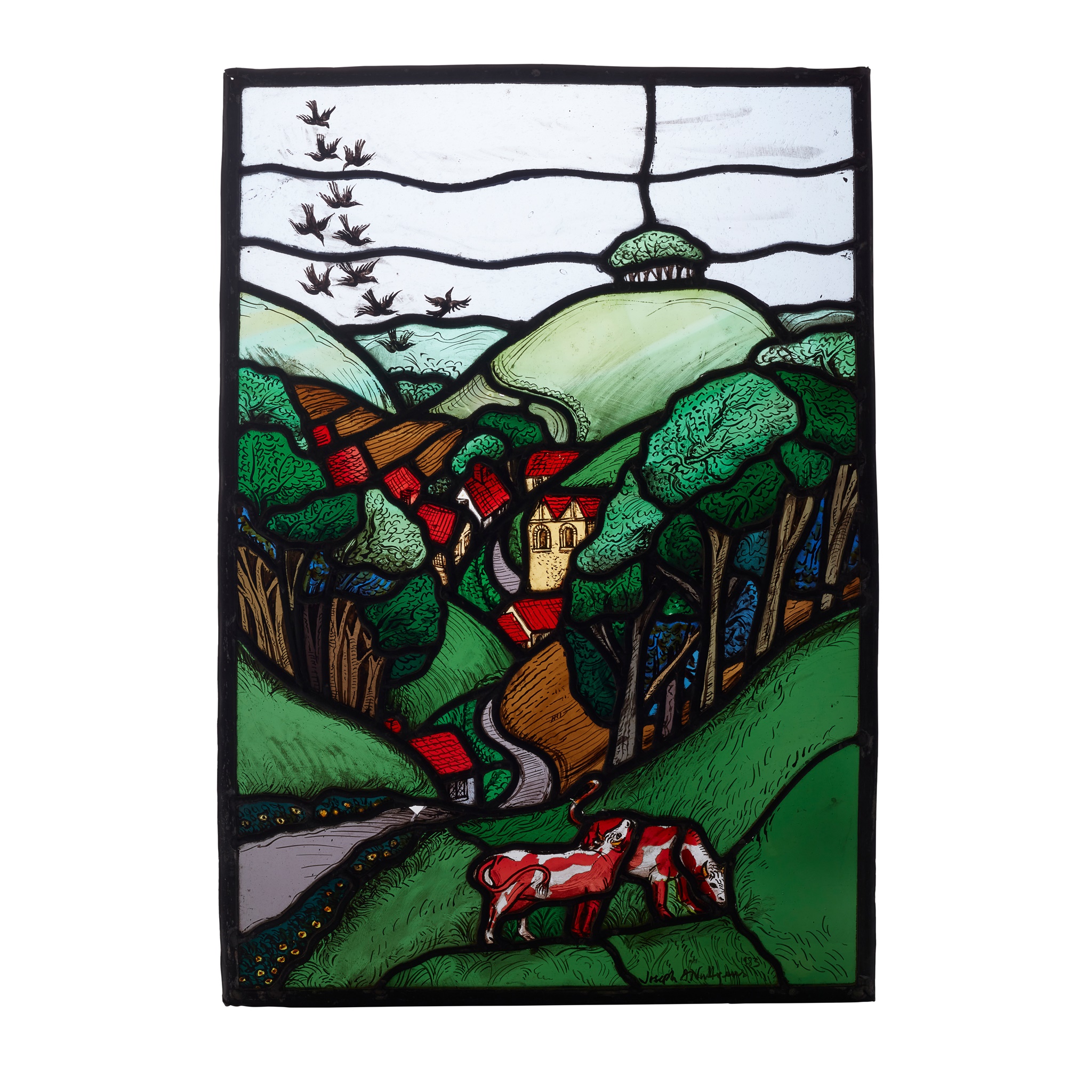 stained, painted and leaded glass, signed and dated lower right JOSEPH A. NUTTGENS 1983