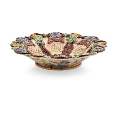 glazed earthenware, impressed mark COLDRUM/ CHELSEA, 16cm high; and an EDWARD BINGHAM (1829–1914) AT CASTLE HEDINGHAM SHALLOW BOWL, glazed earthenware, incised mark EDWARD W. BINGHAM/ CASTLE HEDINGHAM, 26.5cm diameter