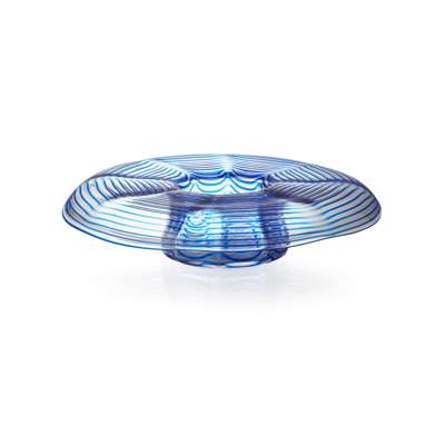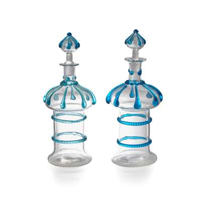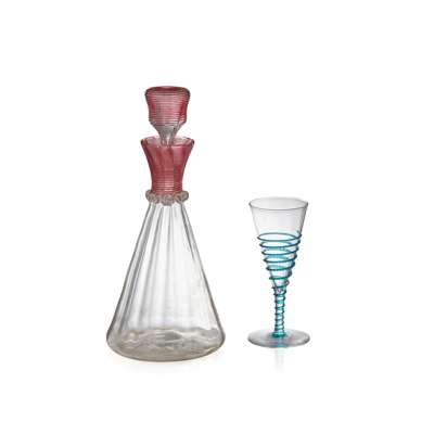 clear glass with applied blue teardrop decoration, 31.5cm high; together with a further DECANTER, clear and applied pink glass, 24.5cm high; a LIQUEUR GLASS, with applied blue glass, 13cm high; and a SHALLOW BOWL, clear and blue threaded decoration, 26cm diameter