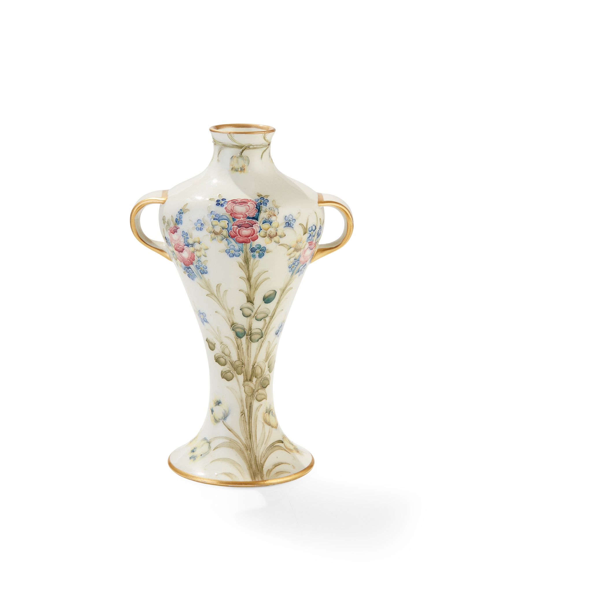 ‘FLORIAN WARE’ ROSE, TULIP AND FORGET-ME-NOT TWIN-HANDLED VASE, CIRCA 1910