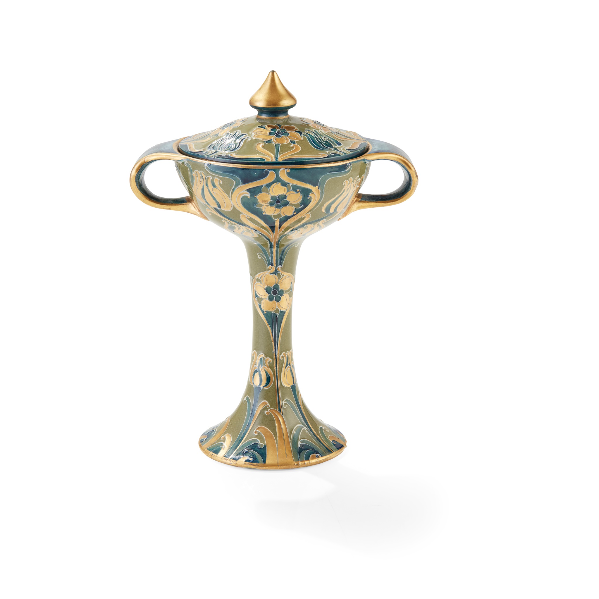 ‘FLORIAN WARE’ GREEN AND GOLD CHALICE & COVER, CIRCA 1900